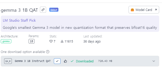 1B instruct 8비트(1기가)와 4비트(700메가)가 있는데 4비트(QAT) 모델이 당연히 좀더 빠른데 충분히 쓸만하다.