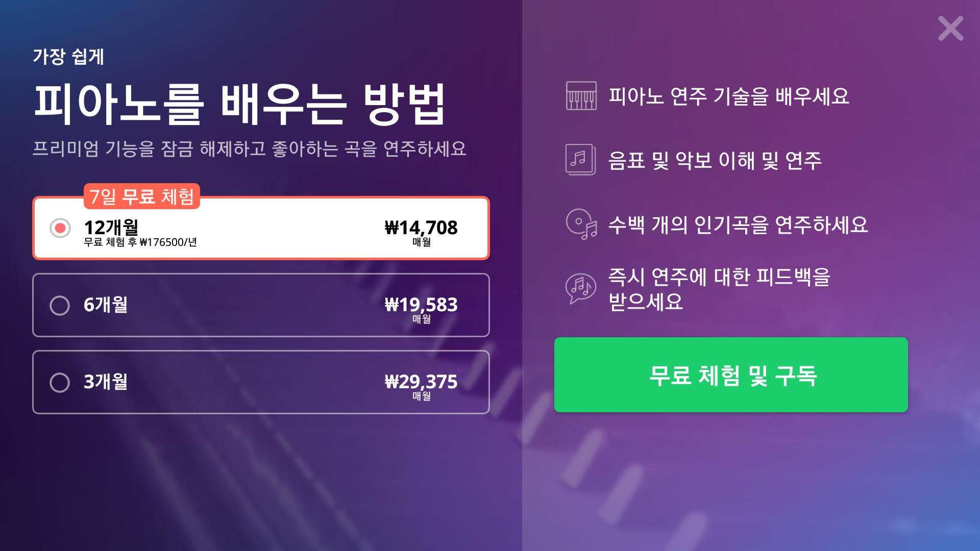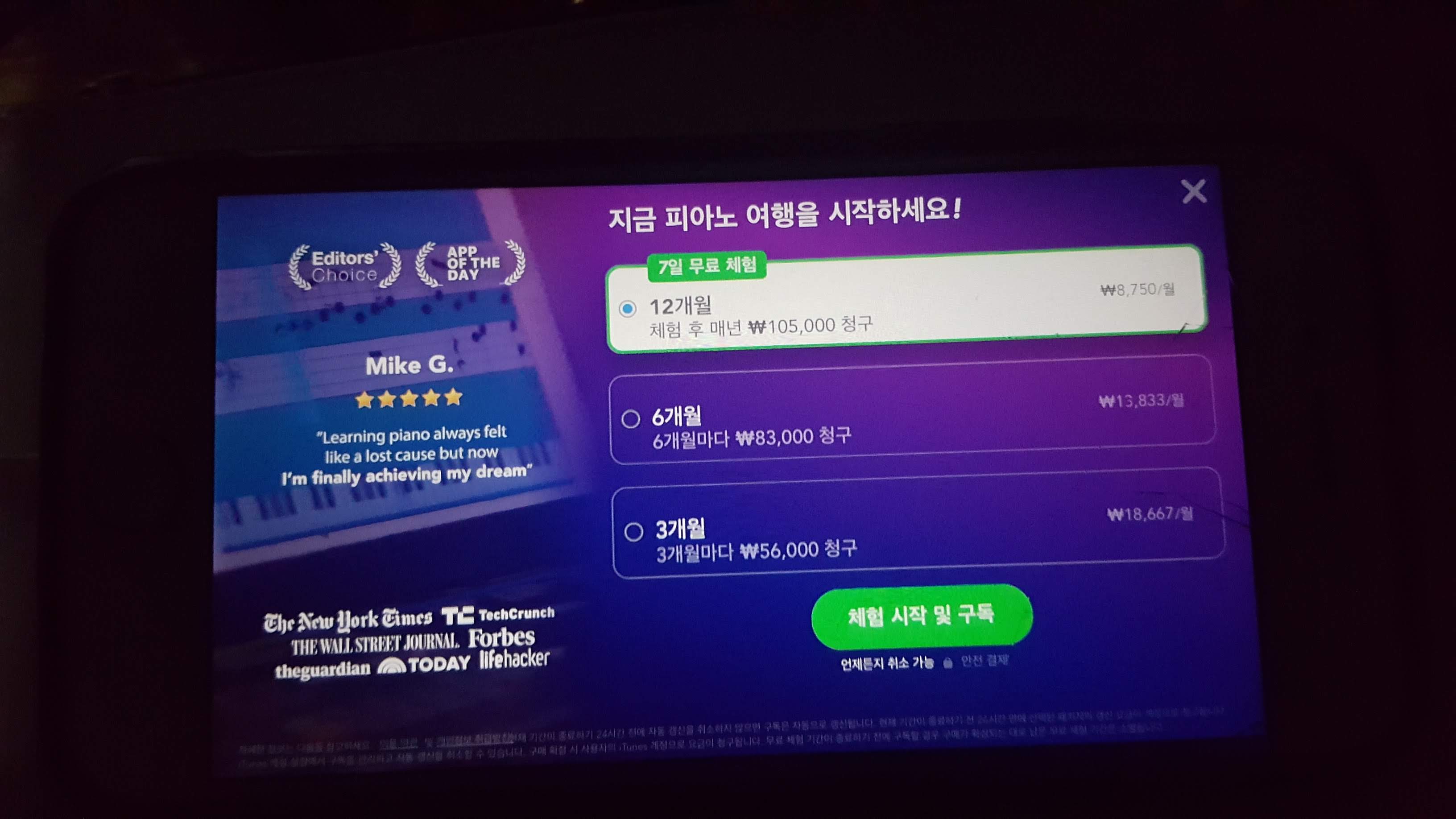 안드로이드에서 혼자 사용할거고 처음배우고 나한테 맞나 안맞나 확인해볼려고 한다고 응답하고 나이는 20대로 입력한 (나이가 상관있는지는 모르겠다) 경우가 가장 저렴한 1년 기준 월 7500이 나와서 구매하였다(7일 체험 신청. 7일후 1년치 자동결제)