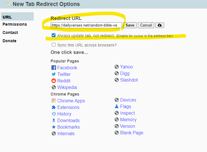 3. 아래에 원하는 페이지의 주소를 붙여넣습니다.( dailyverses.net/random-bible-verse-picture ). 그 아래 옵션에 체크를 해주어야 새 창을 열었을때 해당 페이지가 보이면서도 커서가 주소창에 위치하면서 바로 주소나 검색어 입력이 가능한 상태가 됩니다.