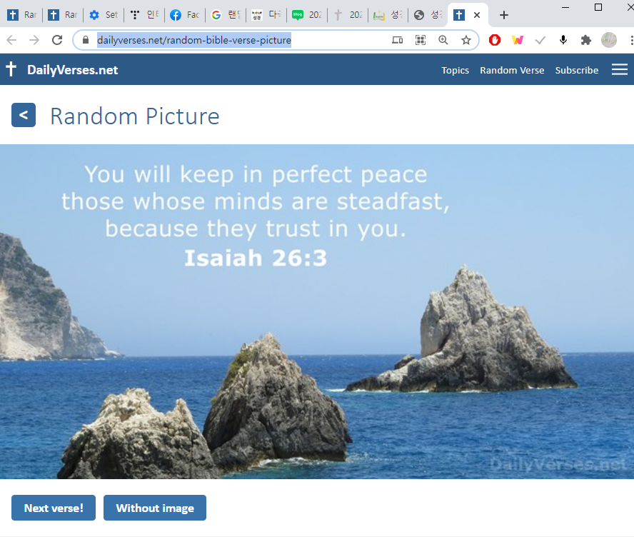 4. 설정 완료후 새 창을 열었을 때의 모습입니다. 랜덤으로 성경 구절 이미지를 띄어주는 사이트입니다. 열때마다 랜덤으로 바뀌어서 좋습니다.