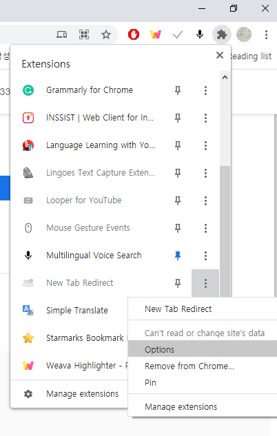 2. 설치후 아래와 같이 퍼즐 모양의 아이콘을 눌러 "New Tab Redirect" 프로그램의 옵션으로 들어갑니다.