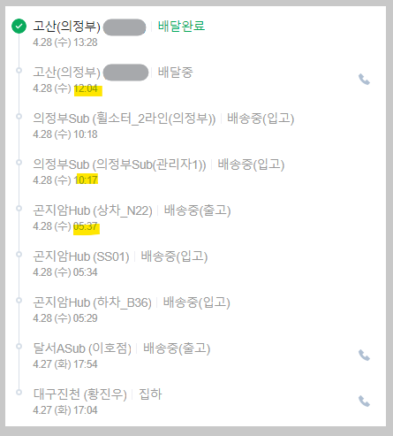 곤지암 허브에서 새벽 5시 반에 상차(출고)가 되어 의정부로 출발하였기에 오늘 받을 수 있을까 없을까 확신이 없었는데 10시 좀 넘어서 의정부에 도착했다고 하고 오후 12시가 좀 넘어 배송예정 문자를 받고 당일 1시 반에 배달 완료되었습니다.