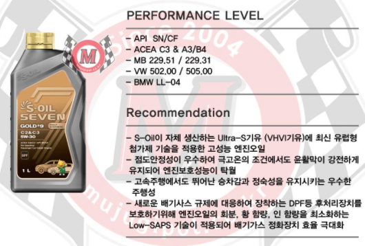 C2/C3 : API등급:SN,CF / ACEA등급 C2,C3 / 벤츠규격 : MB229.31, MB229.51 / 폭스바겐규격 : VW502.00, VW505.00 / BMW규격 : BMW LL-04