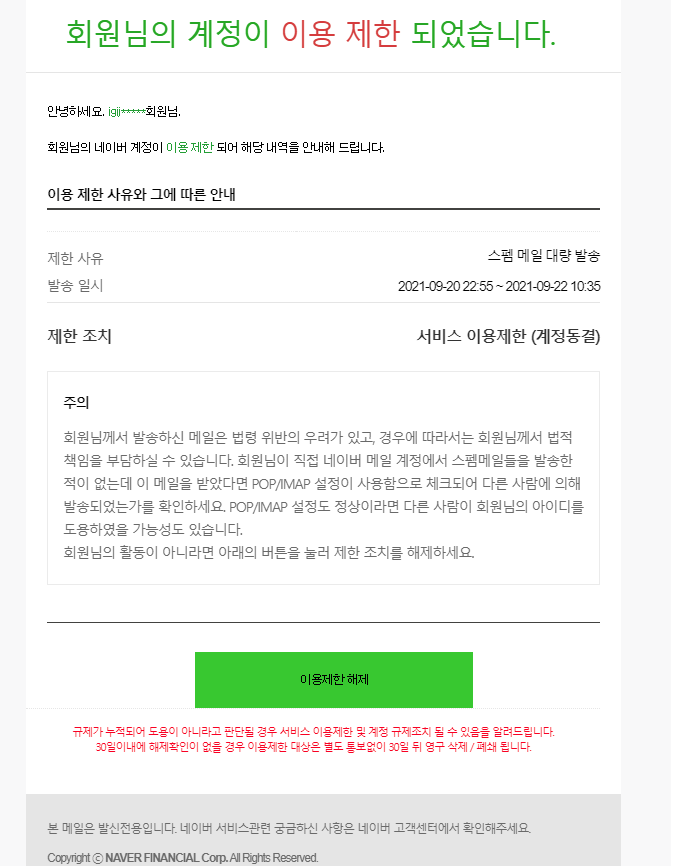 [중요] 회원님의 계정이 이용제한 되었습니다.